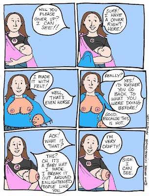 Quite frankly, I don't see what the big damn deal is. You see more tits on daytime television and commercials than you do during a breastfeeding session any day. Now don't get me wrong, I don't necessarily want to see a boob while I'm eating in public or whatever, but if I just so happen to, I'm not going to spontaneously combust. I've read it somewhere, that mothers who breastfeed in public should be careful...that there could be someone who was sexually traumatized in their past, and witnessing a woman breastfeeding could trigger them...I don't mean to sound heartless, but how in the hell can you ask a mother to care more about a PERFECT STRANGER than her hungry child??? I'm sorry, but that's the dumbest shit I've ever heard. It's not like a mother can look around the room and tell that someone has been sexually traumatized, or is a rapist or pervert and say "Oh, I better not breastfeed here, there's a rapist in the room..." Anyway, I said this would be brief, but then again, this is MOM RANT MONDAY. Right or wrong, that's my humble opinion on that! :-)